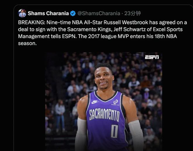 果然,威少的下家也确定了,那就是西部的国王队。