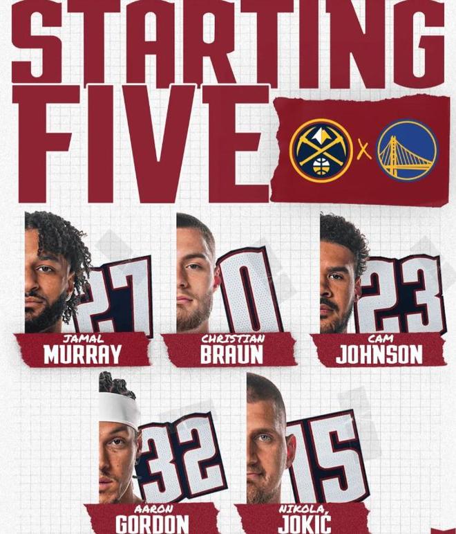今天比赛,首发阵容方面,勇士队这边,穆迪继续因伤缺阵,科尔排出的最新首发五人组为:斯蒂芬-库里、布兰丁-波杰姆斯基、吉米-巴特勒、乔纳森-库明加、德雷蒙德-格林;掘金队这边,全员可以出战,首发阵容则为:贾马尔-默里、克里斯蒂安-布劳恩、卡梅伦-约翰逊、阿龙-戈登和尼古拉-约基奇。