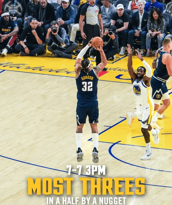 半场数据,掘金队这边,阿龙-戈登出战15分钟,8投7中(三分7中7),砍下25分2篮板1助攻,创下个人生涯半场得分新高纪录,也同时超越贾马尔-默里的6记创造掘金队史新纪录,还追平了NBA历史上半场以100%命中率投进的三分纪录;约基奇出战17分钟,8投5中,三分5中2得到14分7板5助攻1盖帽;穆雷出战15分钟,9中6得到12分2板6助攻3抢断。